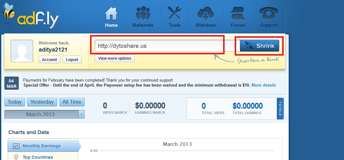 Banyaknya situs – situs yang dapat menghasilkan uang seperti situs untuk memperpendek URL PPC, mencari referral, maupun sejenisnya, yaitu tny.cz, adfoc.us, google adsense, Hubpages, Bukisa, dan masih banyak lagi, dan kali ini saya akan share cara mendapatkan dollar dari AdF.ly, mungkin bagi kalian sudah tahu AdF.ly tetapi bagi yang belum mengetahuinya bisa dicoba untuk menambah uang saku.
